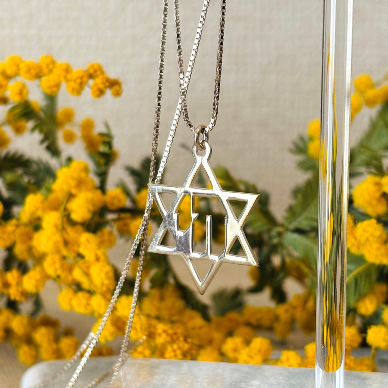 ダビデの星の中にヘブライ語の”Chai(いのち)”が彫られた、珍しいデザインの
